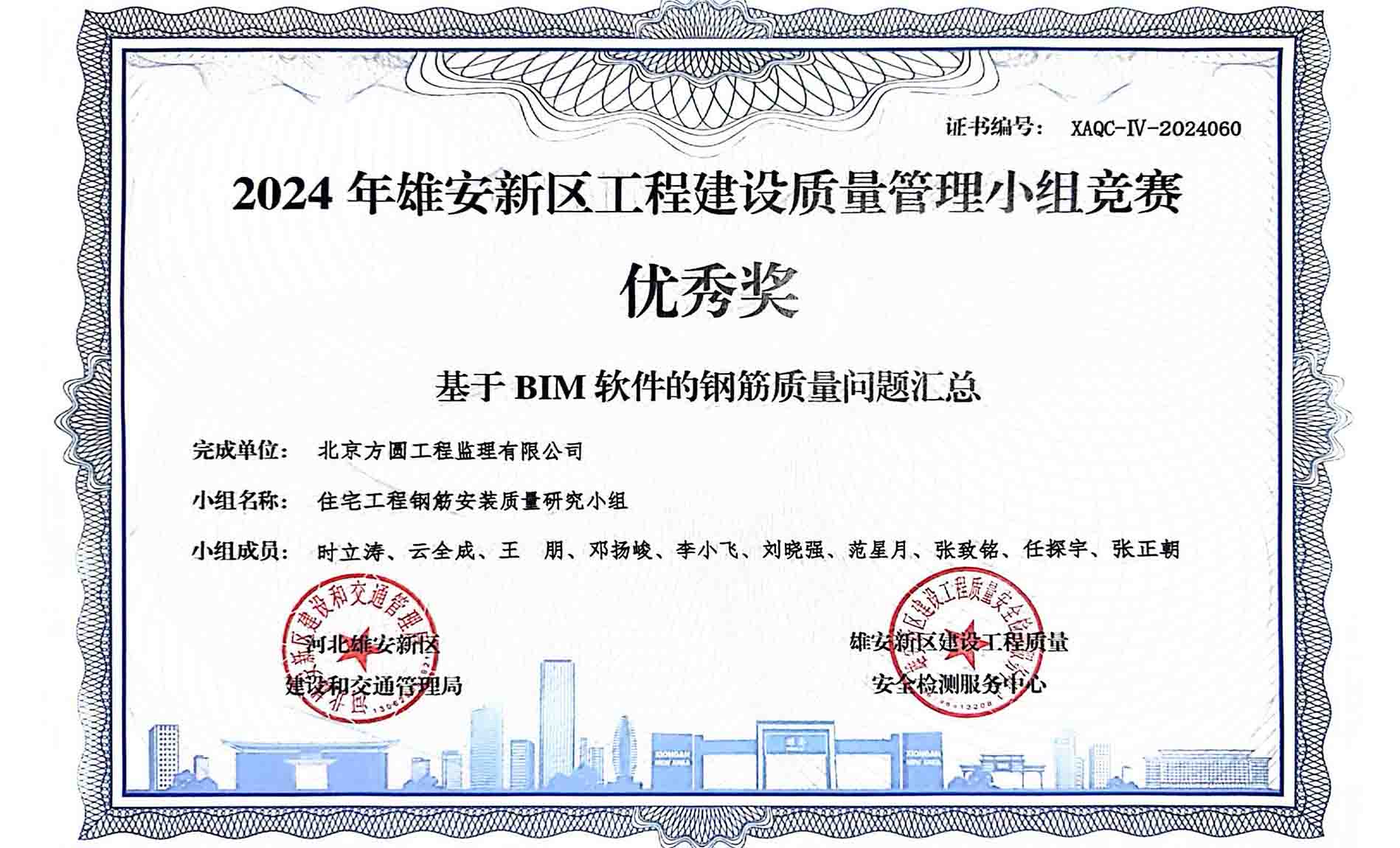 2024年12月,公司雄安新區(qū)中綠里項(xiàng)目參加了2024年雄安新區(qū)建設(shè)工程質(zhì)量管理小組競賽活動(dòng),由該項(xiàng)目監(jiān)理部和公司BIM研究所主要人員組成的研究小組提交的《基于BIM軟件的鋼筋質(zhì)量問題匯總與優(yōu)化研究》成果,憑借其創(chuàng)新